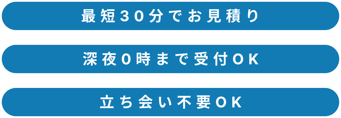 最短30分見積り、深夜0時まで受付、立ち会い不要対応、写真・動画による作業報告など、お客様のご都合に合わせた柔軟なサービスを提供します。