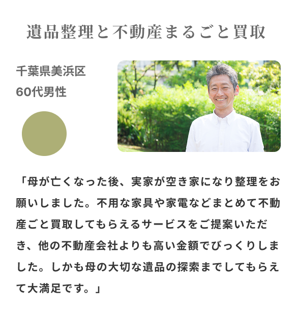 遺品整理から不動産買取まで、遺品込み不動産の「まるごと買取」まで自社一貫対応。複数業者への依頼が不要で、コストと手間を大幅に削減できます。