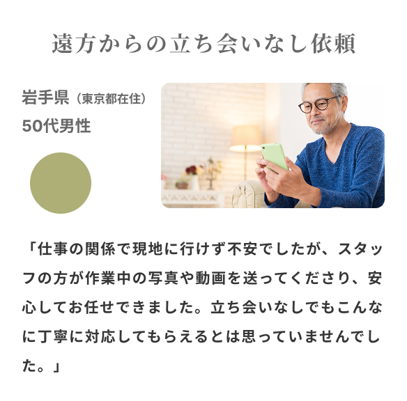 遠方にお住いのご依頼主様の場合、立会なしで鍵をお預かりして作業を進めることもできますのでお気軽にお申し付けください。